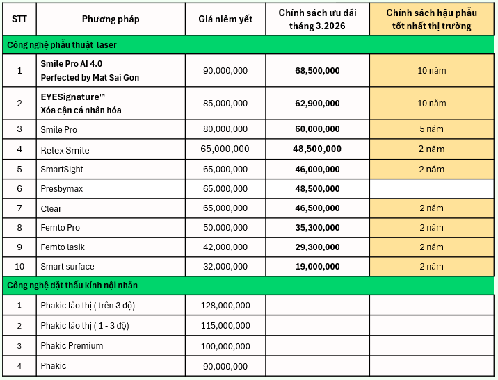 Hệ thống Mắt Sài Gòn trân trọng thông báo các ưu đãi dành cho khách hàng có nhu cầu phẫu thuật khúc xạ trong tháng 03/2026, với những ưu đãi cụ thể như sau: